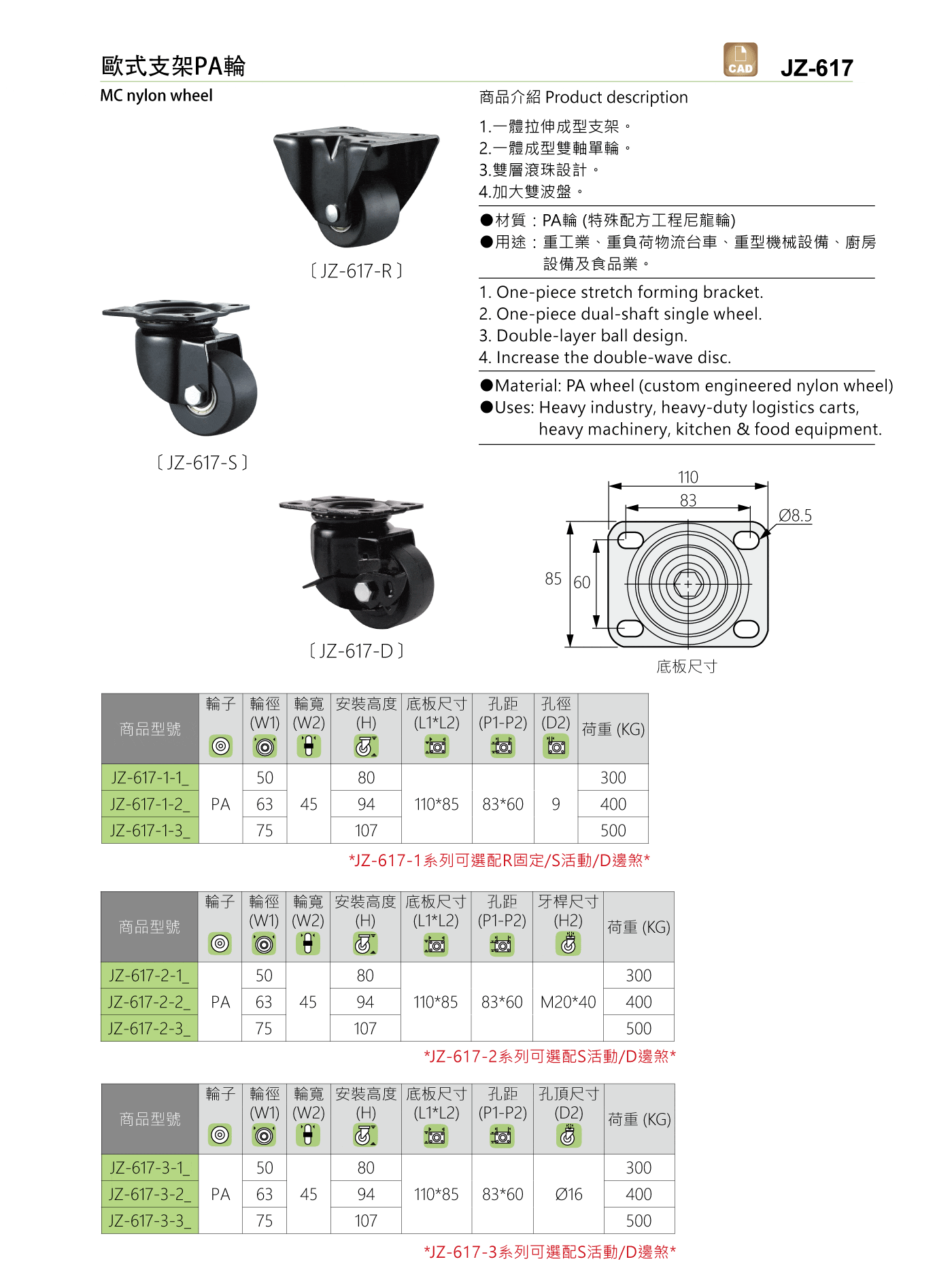 - JZ-617-1系列可選配 R固定 S活動 D邊煞