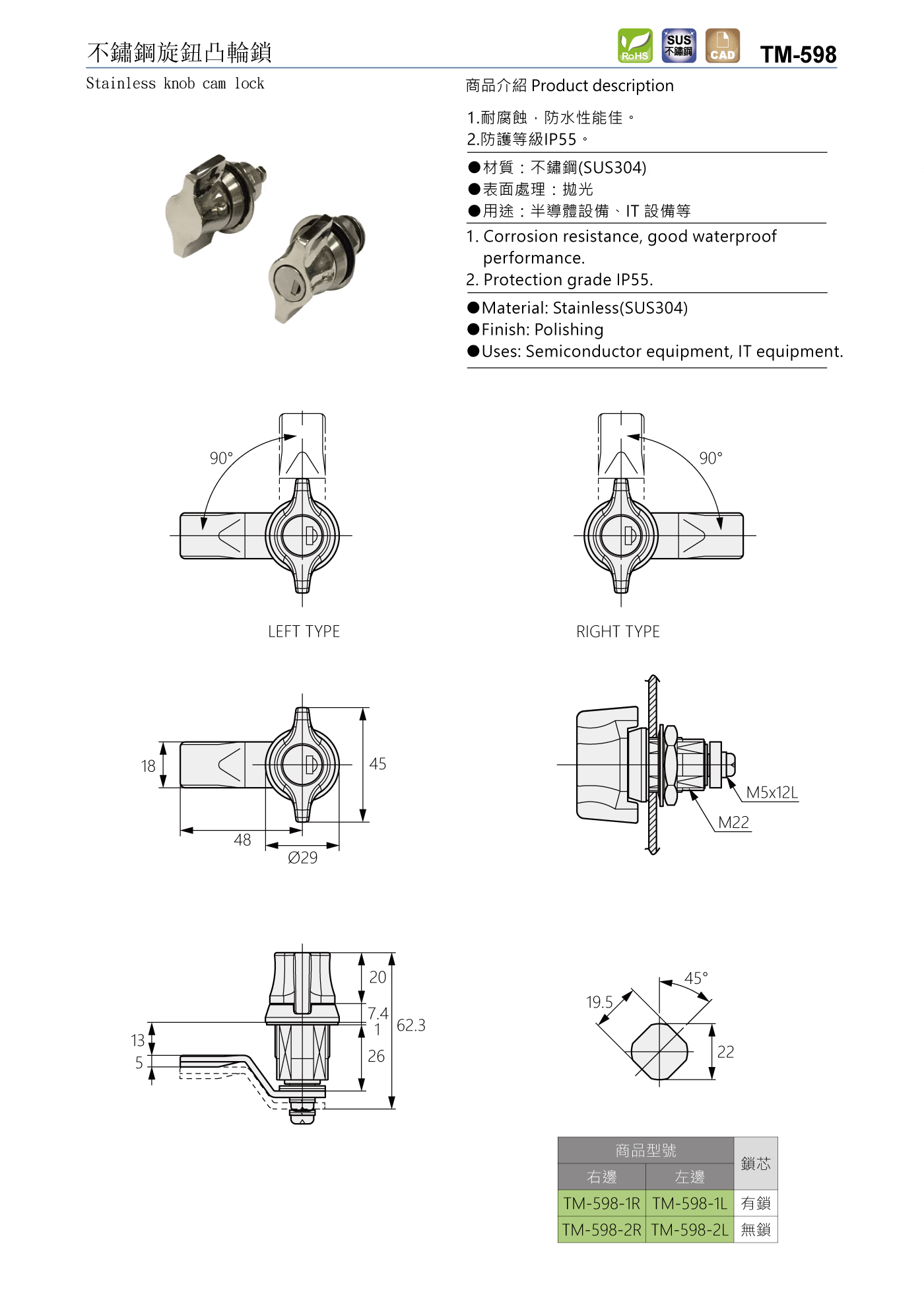 TM-598 不鏽鋼旋鈕凸輪鎖